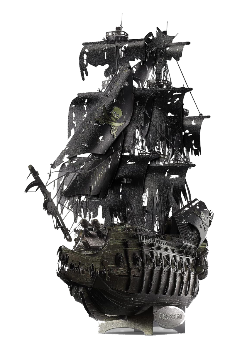 Even before assembly begins, the character of the model is clear.The metal sheets are finely etched with layered hull planks, ornate railings, and aggressive sail geometry, hinting at the ship’s ghostly reputation. The dark metallic finish adds depth and atmosphere, giving the model a dramatic presence that feels intentionally aged rather than decorative.This is not a casual toy. It is a model designed to be built slowly and appreciated closely.