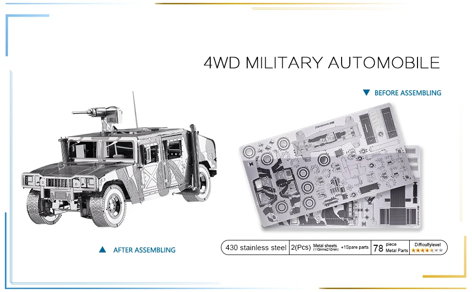 During assembly, builders can clearly experience how individual metal components come together to form a stable and realistic vehicle structure. Once completed, the model stands as a miniature tribute to military mobility—compact, solid, and full of character—making it an ideal display piece for fans of vehicles, mechanics, and military design.