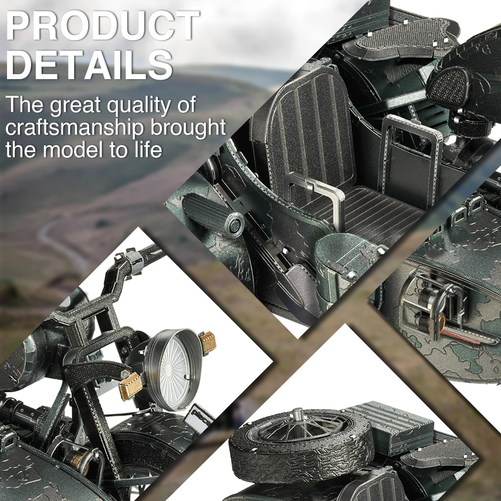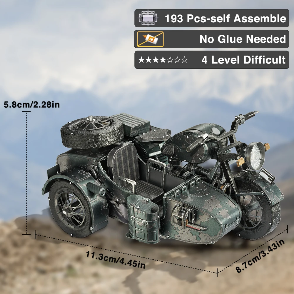 Piececool 750 Motorcycle DIY metal model kit represents a CJ750 model, derived from the 1956 Soviet IMZ M-72, itself influenced by the 1938 German BMW R71. Almost all CJ750 models come equipped with sidecars, emphasizing a design heritage that traces back to both Soviet and German motorcycle engineering.