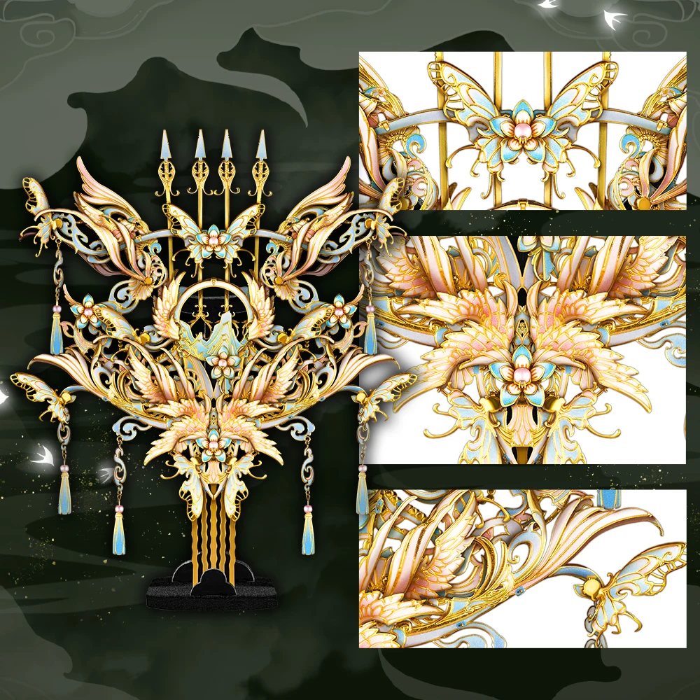 Inspired by the elegant form of the harp and the delicate silhouette of traditional ornamental combs, the Harp Comb merges musical rhythm with refined craftsmanship. Its flowing curves echo harp strings, while the layered metal structure recreates the lightness and balance of a ceremonial hair accessory.