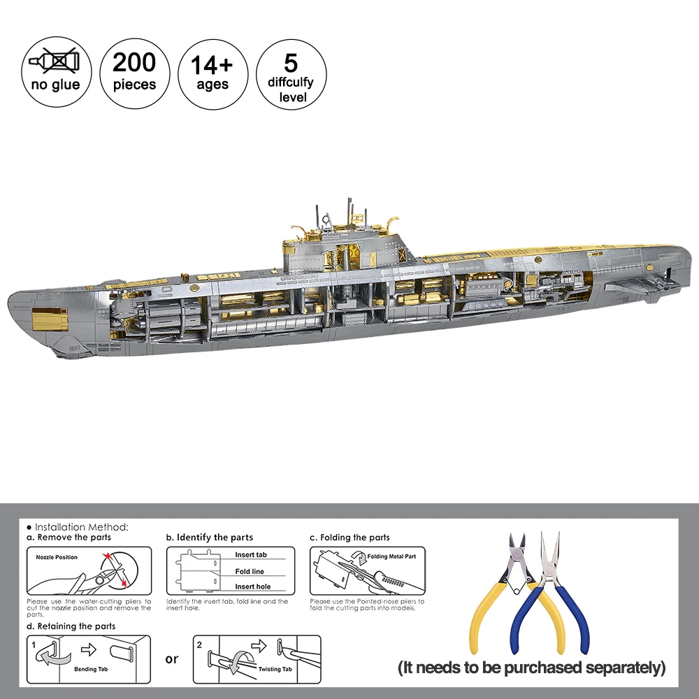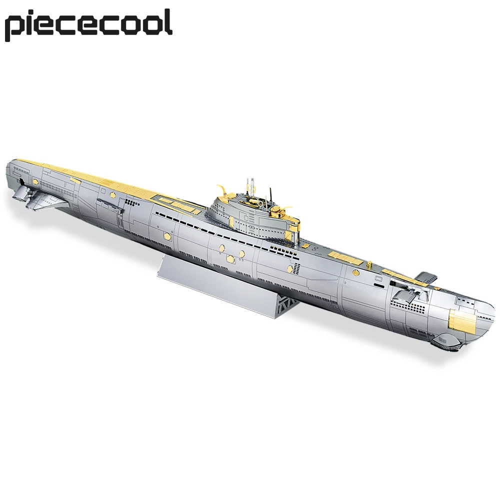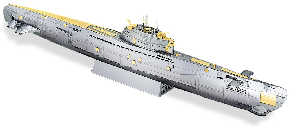 The Piececool Submarine DIY Metal Model Kit is a premium 3D replica of a classic military submarine, crafted from stainless steel for durability and a polished finish. With precisely laser-cut parts, this model challenges enthusiasts to carefully bend, twist, and assemble each component into a sleek, display-ready submarine. Measuring a compact yet impressive size, it is perfect for desks, shelves, or display cases.